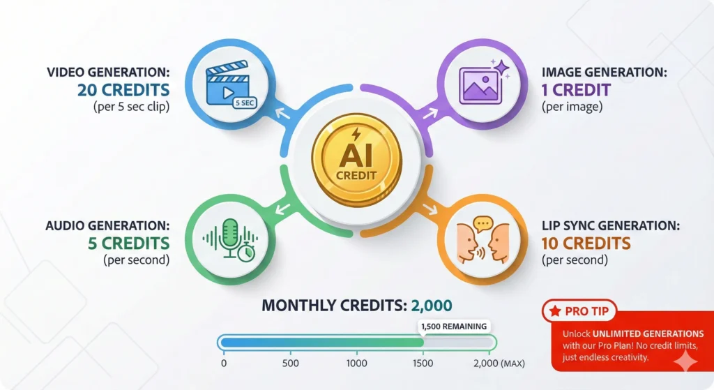 A: Standard ($9.99/month) gives you 2,000 credits, up to 20 video generations, and 6 minutes of audio translation. Pro ($19.99/month) doubles those limits to 4,000 credits, 40 videos, and 13 minutes of audio. Both include unlimited standard image features. Pro makes sense if you generate more than 100 images weekly.