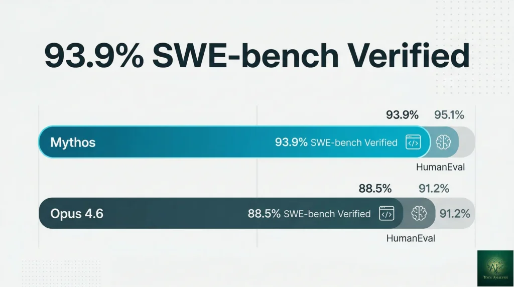 On SWE-bench Verified — the benchmark that tests whether an AI can actually resolve real GitHub issues end-to-end — Mythos scored 93.9%. Claude Opus 4.6, Anthropic’s current public flagship, sits at 80.8%. GPT-5.4, OpenAI’s equivalent, is at roughly the same level. A 13-point gap on a benchmark this practical is not incremental progress. It means Mythos can independently resolve nine out of ten real software problems that would stump a capable developer.