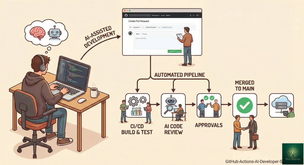 Here is where things get interesting for 2026. Developers are increasingly using AI coding agents to write code, and GitHub Actions PR workflows to verify it. The combination creates a safety net that makes AI-assisted development practical.