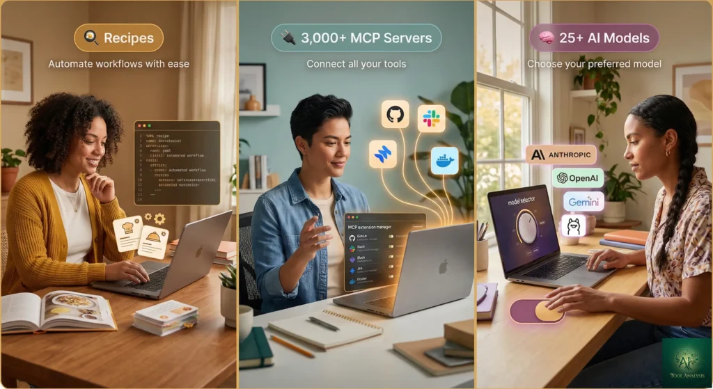 A: A recipe is a reusable YAML workflow definition that packages a complete task with goals, required extensions, structured inputs, and sub-recipes. Teams share recipes for consistent automated workflows. Think of them as saved macros for AI agent behavior.