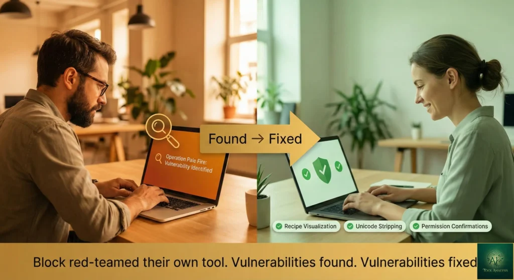 What happened next matters more than the vulnerability itself. Block’s Detection and Response Team identified the attack quickly, and the development team implemented fixes in both the internal and open-source versions: recipe visualization so users can see what a recipe actually does before running it, Unicode character stripping to prevent hidden instructions, improved permission confirmations, MCP server malware checking, and adversarial AI monitoring (using another AI to check for malicious prompts).