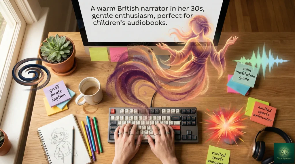 Here’s what that looks like in practice. You write a prompt like: “A warm female narrator in her 30s with a slight British accent, speaking at a measured pace with gentle enthusiasm, suitable for children’s audiobooks.” Qwen3-TTS synthesizes a brand-new voice matching that description. No audio samples, no training data, no extra cost.