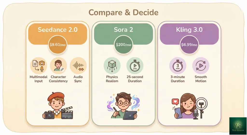 Use Seedance 2.0 if: You have reference materials you want replicated, need character consistency, create short-form content, or want cinema-quality video without Sora 2’s $200/month price tag.